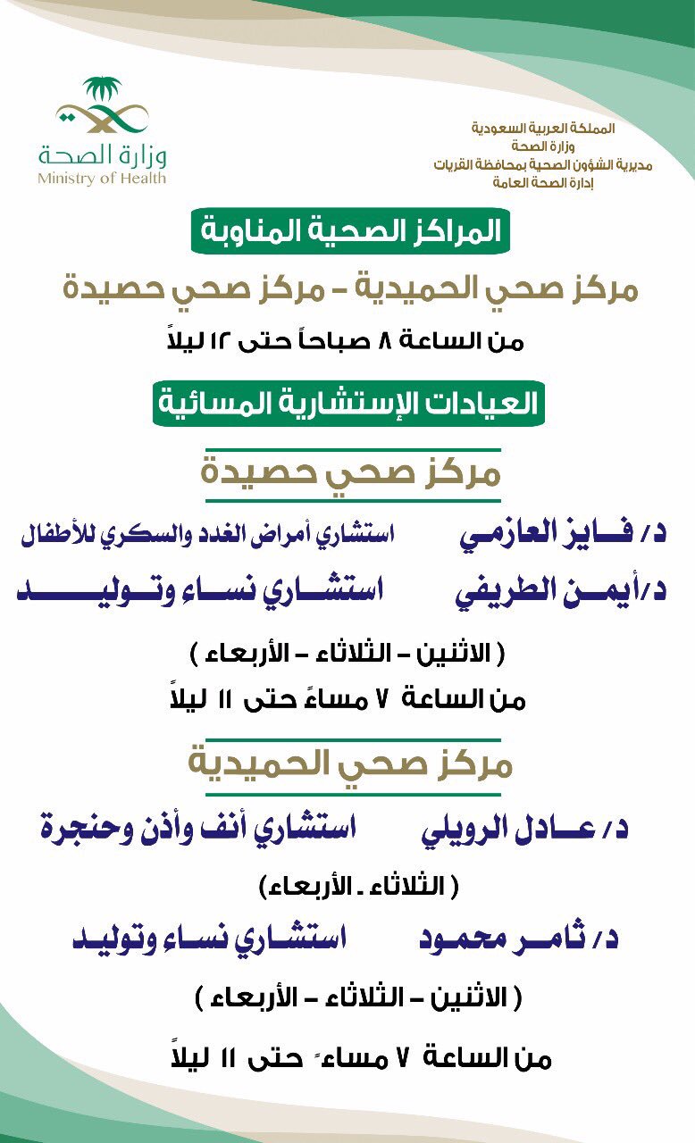 دوام المراكز الصحية 2017. واوعز الدكتور جابر الى مديري الصحة بالعمل على تحديد دوام بعض المراكز الصحية الشاملة ليكون على مدار 24 ساعة وفقا للاحتياجات ولتسهيل وصول المرضى اليها والحصول على الخدمة الصحية بعد انتهاء. مواعيد دوام المراكز الصحية في العيد 1441 اوقات عمل المراكز الصحيه بالعيد 2020. ووفق التعميم فإن جميع المراكز الصحية ستعمل من الساعة الـ ١٠ص إلى الـ٤. دوام المراكز الصحية في شهر رمضان.